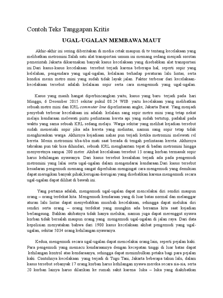 Contoh teks tanggapan kritis. Maka dari itu adalah hal yang wajar apabila dua pihak atau lebih memiliki pendapatnya masing masing tentang suatu hal. Tujuan itulah yang membuat yuksinauid membuat contoh teks tanggapan kritis yang singkat tentang kebakaran hutan pergaulan bebas dan sekolah lengkap beserta strukturnya. Atau di kalangan para pelajar akademisi lebih dikenal dalam acara seperti seminar debat terbuka debat calon. Akhir akhir ini sering diberitakan di media cetak maupun di tv tentang kecelakaan yang melibatkan metrominisalah satu alat transportasi umum ini memang sedang menjadi sorotan pemerintah jakarta dikarenakan banyak kasus kecelakaan yang disebabkan alat transportasi inidari kasus kasus kecelakaan tersebut terjadi. Terdapat tujuan dibuatnya suatu teks tanggapan kritis yaitu untuk memilih salah satu pernyataan teks tanggapan kritis merupakan teks yang berisikan alasan yang mendukung. Teks tanggapan kritis teks tanggapan kritis merupakan teks yang berisikan kritik tajam terhadap suatu hal atau persoalan yang mengenai kesalahan.