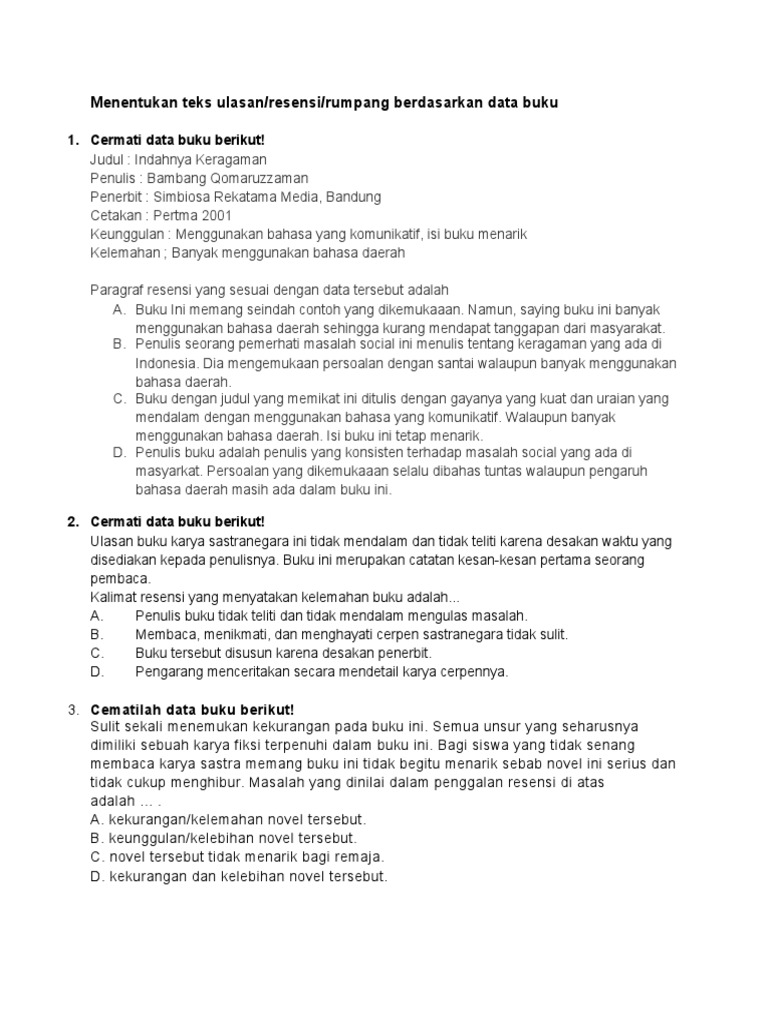 Teks ulasan dapat juga disebut dengan resensi suatu teks mengenai penilaian terhadap suatu karya dapat berupa film novel buku atau cerpen. Bisa juga berupa ulasan yang buruk tergantung dari pandangan sang pengulas. Contoh teks ulasan teks ulasan atau yang juga biasa disebut sebagai resensi ini dibuat untuk memberikan penilaian terhadap karya seseorang baik itu dalam bentuk buku film musik ataupun karya lainnya. Pada saat mengulas sebuah karya milik orang lain penulis wajib bersikap kritis serta tidak tendensius tidak memihak atau bersikap netral demi kemajuan karya tersebut di kemudian hari. Contoh teks ulasan novel film cerpen album lagu drama identitas karya puisi ilmu pengetahuan buku yang singkat lengkap baik dan benar. Pengertian teks ulasan adalah teks yang berisi ulasanpenilaianreview terhadap suatu karya film novel buku cerpen drama.