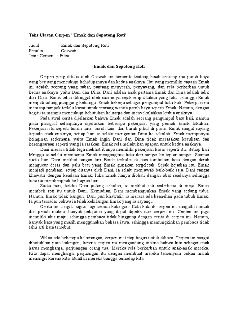 Teks ulasan adalah sebuah tulisan yang berisi ulasanpenilaianreview terhadap sebuah karya milik orang lain. Tepatnya sejak tahun 2015 cerpen dengan tema kekeluargaan dan sosial ini dipublikasikan. Fungsi dari teks ulasan ini banyak beberapa diantaranya adalah memberitahu pembaca. Penilaian yang disampaikan atau dituangkan dalam teks ulasan ini harus kritis tidak boleh ada maksud lain di dalam sebuah teks ulasan yang dibuat.