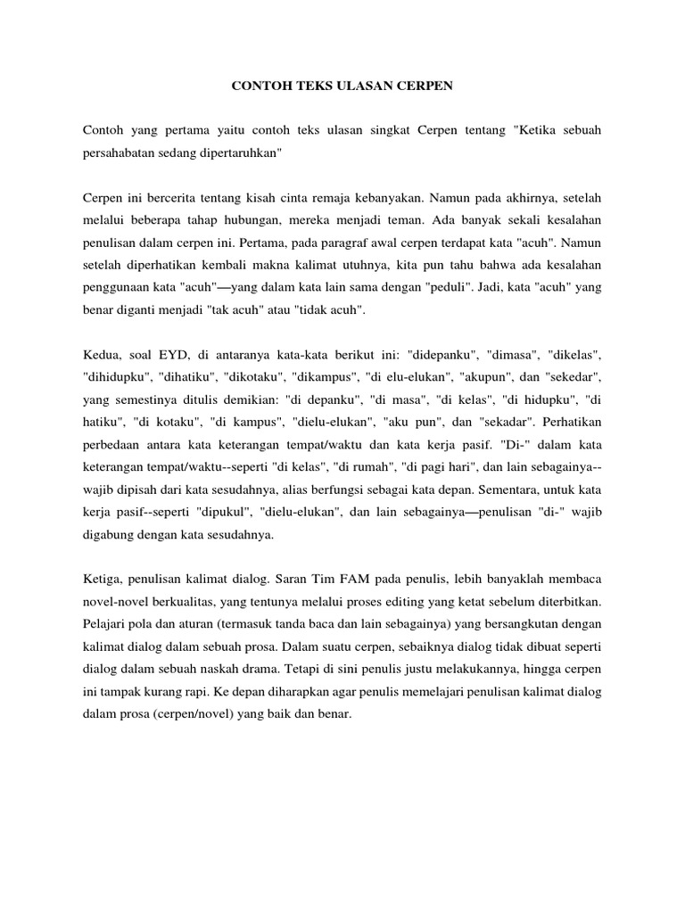 Contoh teks ulasan seringkali jika kita tidak bisa menikmati sebuah karya akan ada orang baik yang membuat sebuah ulasan mengenai karya tersebut. Cerpen atau cerita pendek merupakan suatu bentuk prosa naratif fiktif. Selain itu cerpen atau cerita pendek cenderung padat dan langsung pada tujuannya jika dibandingkan karya karya fiksi lain yang lebih panjang seperti novella novel. Karya tersebut bisa berupa film buku novel cerpen drama lagu dan lain sebagainya. Pengertian teks ulasan contoh ciri tujuan struktur dan kaidahnya sebagai insan akademik kita tentu harus membaca karya karya ilmiah antara lain buku. Cara membuat teks.