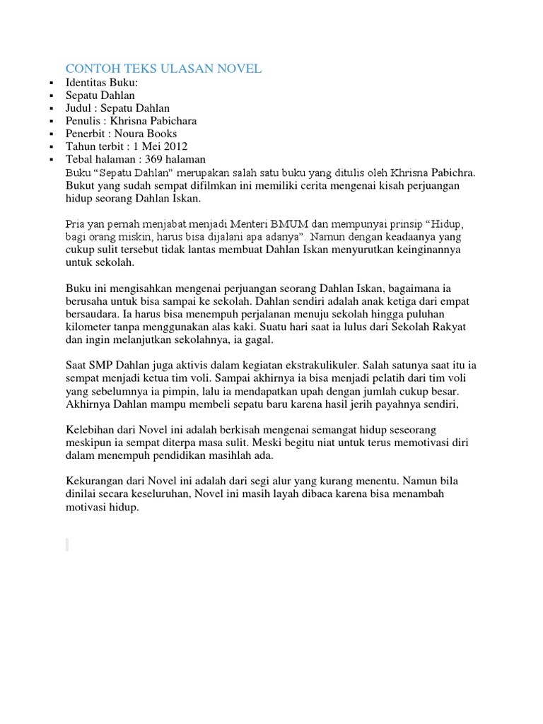 Contoh teks ulasan novel beserta strukturnya. Pengertian teks ulasan contoh ciri tujuan struktur dan kaidahnya sebagai insan akademik kita tentu harus membaca karya karya ilmiah antara lain buku. Pada saat kita membaca buku kita harus mencerna buku bacaan tersebut dengan seksama agar kita dapat memahami isinya. Ada teks ulasan novel film buku cerpen beserta kelebihan dan kekurangannya. Contoh teks ulasan film 5 cm singkat beserta dengan strukturnya written by ivanwira sunday march 5 2017 add comment semuacontoh yoo para pembaca dan pelajar kali ini saya akan membagikan contoh singkat teks ulasan film indonesia 5 cm yang merupakan salah satu materi pembelajaran bahasa indonesia yang mungkin teman teman butuhkan untuk referensi mengerjakan tugas. Berikut ini adalah contoh teks ulasan yang baik dan benar. Jika salah satu struktur dalam teks ulasan ini tidak ada maka tidak bisa dinamakan dengan teks ulasan.