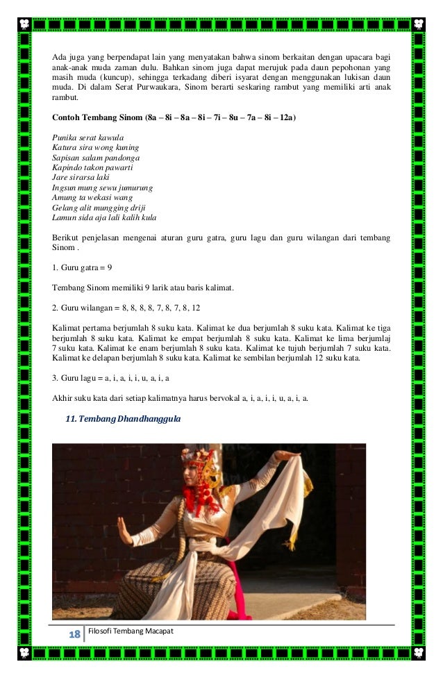 Filosofinya menggambarkan tentang seorang manusia dari lahir mulai belajar di masa kanak kanak saat dewasa hingga akhirnya meninggal dunia. Tembang kinanthi berasal dari kata kanthi dalam bahasa jawa yang artinya tuntun. Dengan adanya aturan berupa guru gatra guru lagu dan guru wilangan maka tembang macapat dibedakan menjadi 11 jenis tembang. 2 april 2015 tumpi readhouse budaya. Tembang kinanthi berisikan bimbingan atau tuntunan yang dilakukan oleh orang dewasa kepada anak anak. Tembang macapat macapat merupakan tembang atau puisi tradisional jawa.