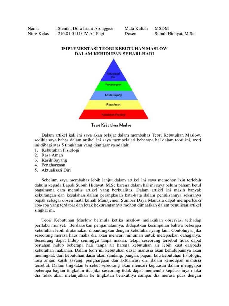 Contoh teori maslow dalam kehidupan sehari hari. Contoh prinsip ekonomi dalam kehidupan sehari hari kebutuhan akan rasa aman setelah kebutuhan fisiologis sudah terpenuhi maka ada kebutuhan rasa aman seperti rasa aman fisik stabilitas ketergantungan perlindungan dan kebebasan dari berbagai ancaman teroris penyakit takut cemas atau bencana alam. Peak experiences disebutkan sebagai momen dalam cinta pengertian kebahagiaan dimana seseorang merasa menyeluruh merasa hidup lebih sadar tentang kebenaran harmoni kebaikan dan lain sebagainya. Hal tersebut bertjuan agar dapat memastikan bahwa semua karyawan yang bekerja di perusahaan tersebut dapat berkinerja sesuai dengan apa yang sudah direncanakan demi mencapai tujuan yang ditetapkan oleh suatu perusahaan. Isi dari teori ini mudah sekali dipahami karena memuat sesuatu dari pengalaman atau perilaku manusia yang pernah dialami namun tidak pernah dimasukkan dalam kata kata. Disamping kebutuhan dasar yang harus dipenuhi sehari hari maslow mengutarakan momen dari pengalaman yang tidak biasa sebagai peak experiences. Maslow menciptakan istilah aktualisasi diri untuk menggambarkan pertumbuhan seorang individu terhadap pemenuhan kebutuhan tertinggi mereka konsep konsep yang paling maju dan pertanyaan besar yang dihadapi manusia seperti mengejar makna hidup.