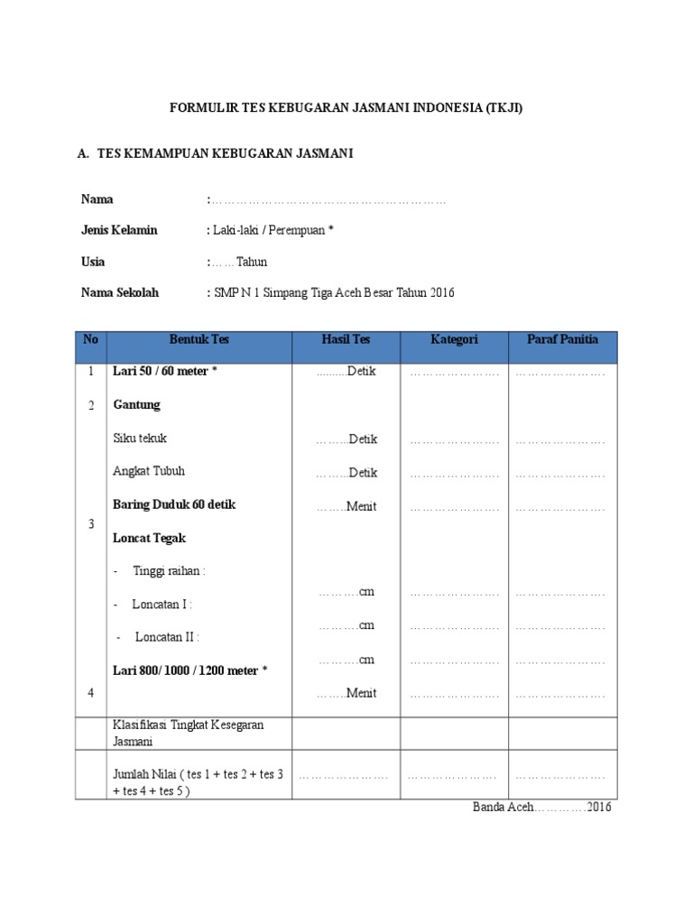 Guna meningkatkan taraf kebugaran jasmani seseorang diperlukan latihan yang berkenaan dengan kondisi fisik. Fungsi tes kebugaran jasmani dapat menjadi indikasi kemampuan tubuh seseorang dalam beraktifitas. Yang perlu kamu tahu. Tes yang ini hampir dapat dilakukan oleh beberapa orang. Tes yang ini hampir dapat dilakukan oleh beberapa orang. Tes ini dapat dilakukan untuk mengetes daya tahan tubuh dan daya tahan ototnya.
