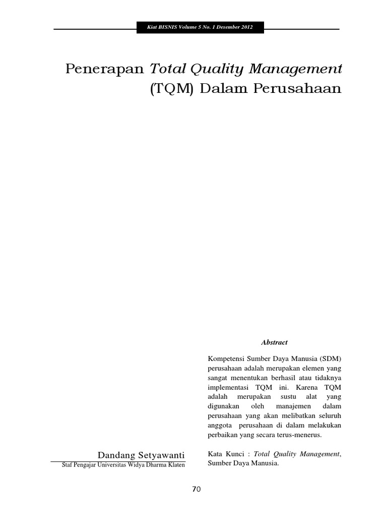 Sementara itu goetsch dan davis 1994 p. Total quality management tqm adalah suatu konsep manajemen yang telah dikembangkan sejak lima puluh tahun lalu yang diambil dari berbagai praktek manajemen usaha peningkatan dan pengembangan produktivitas. Berikut ini beberapa cara agar suatu perusahaan bisa menghasilkan suatu kualitas barang atau jasa yang baik agar konsumenpelanggan bisa tertarik dengan menerapkan tqm total quality management yaitu dengan memerhatikan unsur unsur tqm total quality management sebagai berikut goetsch dan davis 1994. Tqm lebih berfokus pada tujuan perusahaan untuk melayani kebutuhan pelanggan dengan memasok barang dan jasa yang memiliki kualitas setinggi. Komponen utama dari tqm adalah perbaikan terus menerus. Definisi tqm total quality management adalah strategi manajemen yang ditujukan untuk menanamkan kesadaran kualitas pada semua proses dalam organisasi.