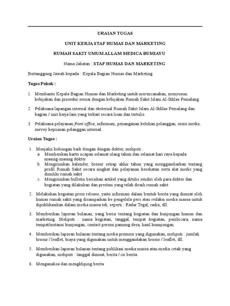 Contoh tugas staff marketing. Marketing merupakan hal yang berperan sangat penting di suatu perusahaan hal ini terjadi karena marketing memiliki fungsi dalam mencari mendapatkan mempertahankan dan memperbanyak konsumen serta menguasai pasar. Sebagai bagian yang memperkenalkan suatu perusahaan kepada masyarakat melalui produk yang dibuat oleh perusahaan tersebut. Hal semacam ini karna pekerjaan paling utama sisi marketing yaitu memperoleh pelanggan sebanyak mungkin. Bertugas dalam menjalin hubungan baik dengan pelanggan dan masyarakat serta menjembatani antara. Tugas utama staff administrasi marketing. Tidak hanya dari sisi pencari kerja terkadang perusahaan pun mencampuradukkan fungsi keduanya.