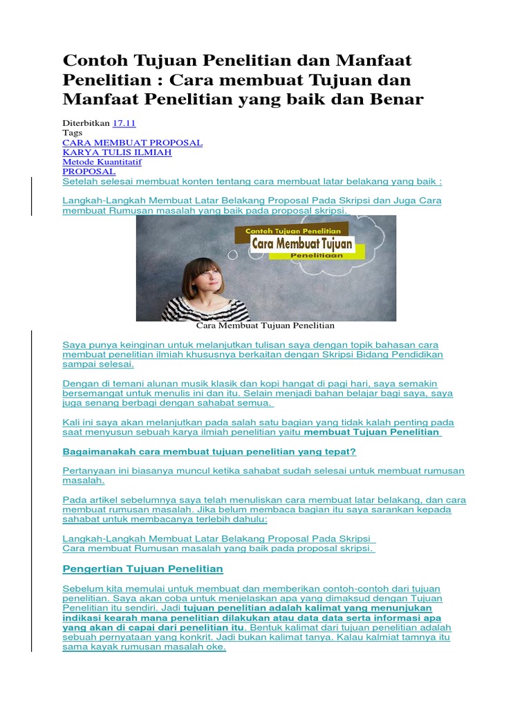 Manfaat penelitian menjadi salah satu bentuk tulisan yang perlu disampaikan dalam bab pendahuluan. Bila penelitian ini selesai dilaksanakan disekolah dalam hal ini sd negeri 2 cihaurbeuti dapat mengambil manfaat dengan adanya peningkatan kemampuan siswa dan dapat dijadikan sebagai masukkan data serta rujukan dalam mengambil suatu keputusan dalam proses pembelajaran di masa yang akan datang. Postingan ini akan memaparkan penjelasan tentang apa itu manfaat penelitian dan tujuan penelitian bagaimana menarasikannya dan seperti apa contohnya. Saya akan coba untuk menjelaskan apa yang dimaksud dengan tujuan penelitian itu sendiri. Contoh manfaat dan tujuan penelitian manfaat penelitian 1. Manfaat teoretis atau akademik dan manfaat praktis.
