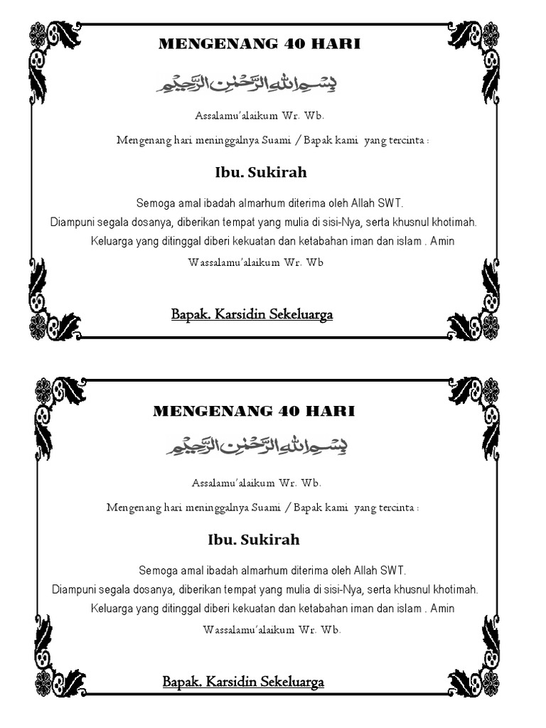 Ucapan dalam dus makanan orang meninggal 1000 hari zhafranrennova. Doc ucapan dos kenduren 1 tahun rahmat juanggit academia edu. Discover ideas about word doc. Contoh undangan 1000 hari orang meninggal word. Nah lumayan rapih bukan untuk mendapatkan file word dari desain kartu ucapan aqiqah di atas anda dapat mendownload nya secara. Bingkai ijazah sengaja kami sajikan sebagai contoh bagi anda yang memang sedang membutuhkan buat melakukan pencetakan blangko ijazah smentara ataupun keperluan lainnya disekolah karena pada dasarnya dalam mendesain template bingkai ijazah pada umumnya setiap sekolah melakukan desain bermotif batik begitupun untuk sertifikat piagam penghargaan masih memiliki kesamaan dengan sertifikat ijazah.
