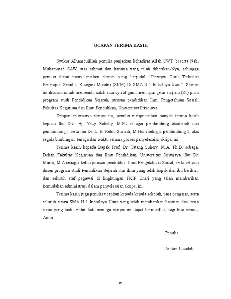 6 4 5 7 created date. Laode rijai msi drs selaku ketua fakultas farmasi univesitas mulawarman sekaligus sebagai pembimbing utama yang telah bersedia meluangkan waktu dan membimbing penulis sehingga mampu menyelesaikan skripsi ini dengan baik. Terima kasih untuk abang tria kilbaskara sp rachmat darmawan amd kep ayuk zulhiliyah spd dan semua keluarga yang tak bisa disebutkan satu per satu dari om tante sepupu dan semua keponakan. Ucapan terima kasih alhamdulillah puji syukur kepada allah swt karena kehendak dan ridha nya peneliti dapat menyelesaikan skripsi ini. Contoh surat ucapan terima kasih adalah surat yang dibuat oleh seseorang dan ditujukan kepada pihak tertentu dengan tujuan untuk menyampaikan ucapan terima kasih dengan cara yang lebih formal. Contoh ucapan terimakasih pada skripsi atau ptk anda sedang menyusun skripsi dan membutuhkan referensi contoh ucapan terimakasih pada halaman awal skripsi.