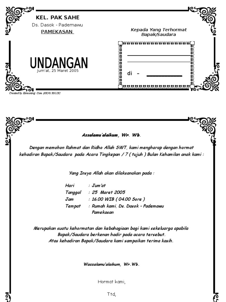 Contoh desain undangan walimatul khamli 7 bulan kehamilan cdr ini tentunya anda udah tau bahwa ekstensinya adalah filetypecdr otomatis software yang bisa digunakan untuk ngedit ngeditnya yaitu software coreldraw. Untuk mengundang tamu ke perayaan ulang tahun kita anda. Berbagai contoh undangan 7 bulanan siap edit. Contoh undangan mitoni contoh undangan selamatan 7 bulan kehamilan contoh undangan tingkebanundangan tasyakuran 7 bulan word undangan gratis doc word free download contoh undangan syukuran 4 bulan 7 bulan filetypedoc bisa diedit ms word gratis download berikut saya sampaikan contoh. Undangan ini juga bisa digunakan untuk acara syukuran 7 bulanan karena isinya bisa diedit. Mohon maaf apabila banyak kesalahan dalam penulisan artikel atau informasi tersebut yang ada kaitannya.