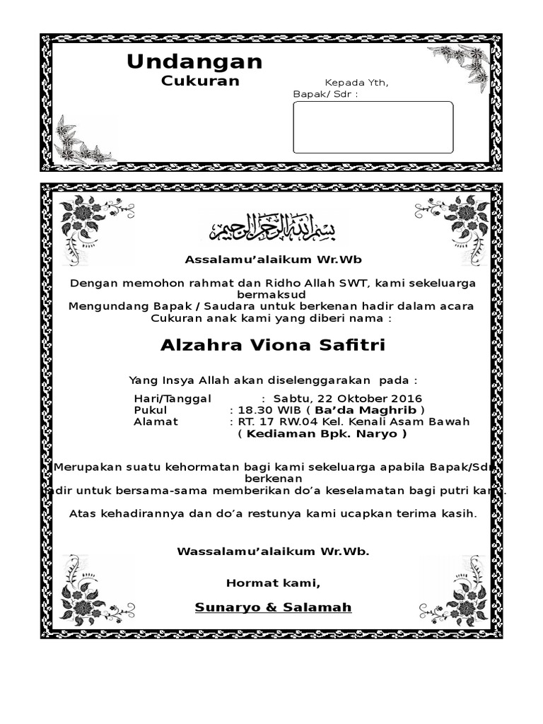 Kami tidak menjual undangan pernikahan di bawah ini gambar2 di bawah adalah undangan pernikahan dari seluruh dunia yang kami kumpulkan sebagai informasi tambahan bagi anda. Contoh undangan aqiqah aqiqah adalah hewan sembelihan untuk anak laki laki atau perempuan yang baru lahir sebagai wujud rasa syukur kita kepada allah swt atas karunia terindah yang telah ia berikan. Anda bisa mengeditnya lalu menyesuaikannya dengan mudah menggunakan aplikasi microsoft word baik di komputer maupun di smartphone seperti android ios. Contoh undangan aqiqah yang baik tidak perlu menggunakan kalimat atau kata kata yang bertele tele. Setelah memastikan semua informasi yang akan masuk dalam desain contoh undangan aqiqah selanjutnya kamu bisa membuat konsepnya. Download desain kartu undangan untuk acara tasyakuran aqiqah.