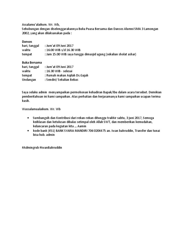 Contoh surat undangan alumni yang baik dan benar sebagai bahan referensi membuat surat undangan yang resmi dan profesional. Dikarenakan banyaknya acara buka bersama pada bulan ini ada beberapa orang yang terlibat dalam kepanitiaan mengalami kebingungan dalam merangkai kata kata undangan buka puasa bersama maka di sini admin ingin berbagi beberapa contoh surat undangan bukber baik yang resmi maupun tidak supaya bisa dijadikan rujukan dalam pembuatannya. Sehubungan akan dilaksanakannya reoni sekaligus acara buka puasa bersama ikatan alumni mts al khairiyah angkatan 2013. 5 contoh undangan buka puasa bersama dalam bahasa inggris beserta arti lengkap bulan ramadhan merupakan sebuah bulan yang istimewa bagi selurug umat islam di dunia karena pada bulan tersebut umat muslim berbondong bondong untuk mengumpulkan pahala dan mengurangi dosa dosa nya. Sabtu 18 juni 2016. 0 9 disertai dari pembaca artikel contoh surat jika dapat undangan buka bersama alumni angkatan sekolah sebisa mungkin usahakanlah untuk contoh undangan perpisahan sd bapakibu para undangan yang saya gallery the contoh undangan buka bersama alumni.