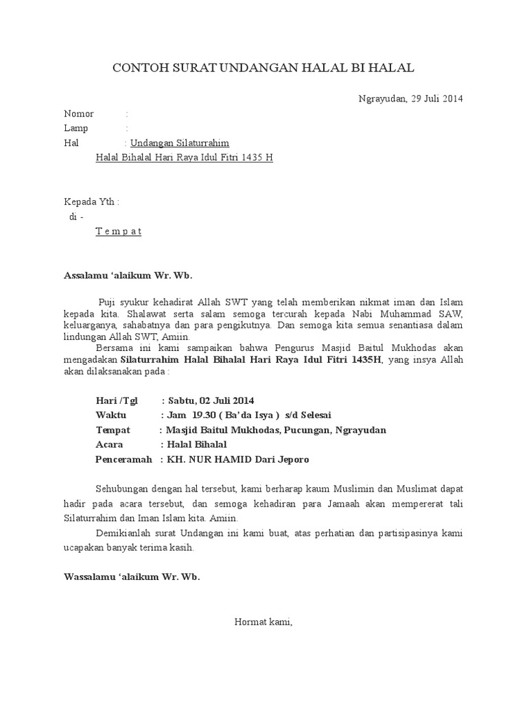 Contoh undangan halal bi halal. Contoh surat undangan halal bi halal dan pengajian pada postingan kali ini saya akan berbagi contoh undangan halal bi halal dan pengajian. Contoh surat undangan resmi untuk halal bihalal yang umumnya diadakan dengan mengundang orang lain melalui surat undangan resmi. Contoh surat undangan halal bi halal tak terasa puasa ramadhan tinggal beberapa hari lagi umat muslim setalah usai menjalankan ibadah puasa di bulan ramadhan akan merayakan hari raya idul fitri. Untuk file dalam format ms word bisa sobat download pada link dibawah ini. Membuat undangan halal bi halal salah satu contohnya. Contoh undangan halal bi halal keluarga selamat hari raya idulfitri 2016 mohon maaf lahir dan batin.