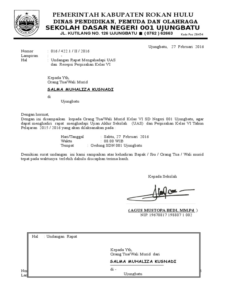 Demikian share contoh surat undangan rapat kepada orang tua wali murid. Berikut contoh format surat undangan rapat untuk orang tua wali murid selengkapnya silahkan download pada links berikut. Diunggah oleh darman tanjung. Contoh surat undangan rapat untuk orang tua wali muriddoc. Keduanya memiliki karakteristik yang berbeda dan digunakan untuk keperluan yang tidak sama. Surat yang saya bagikan ini dikhususnya untuk surat undangan rapat wali murid kelas 6 9.