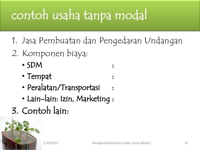 5 contoh peluang bisnis online dari rumah dengan modal kecil. Cara memulai bisnis tanpa modal sama halnya dengan menjalankan bisnis yang menggunakan modal besar ataupun kecil karena menjalankan bisnis tanpa modal pun juga ada beberapa prosedur yang harus dilakukan supaya bisnis tanpa modal menghasilkan uang dan bisa memberikan keuntungan yang lebih besar.