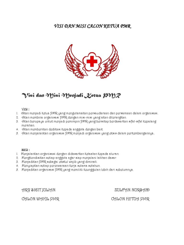 Ketika mencalonkan diri menjadi ketua osis kamu akan diminta untuk menunjukkan visi misi osis. Di sini kamu akan mendapat contoh kumpulan visi dan misi calon ketua osis smp sma dan smk yang menginspirasi. Visi merupakan tujuan utama. Misi pmr terdiri dari. Visi dan misi ini akan sangat berpengaruh pada keputusan teman temanmu untuk memilih kamu atau tidak. Selain itu anda juga dapat menggunakannya saat anda akan mencalonkan diri menjadi ketua suatu organisasi atau lembaga.