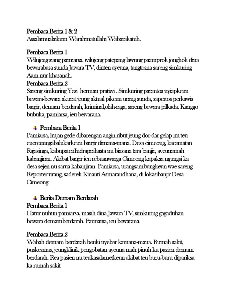 Contoh naskah berita bahasa sunda assalamualaikumwrwb pamiarsa wilujeng patepang sarengdini junivita dina acara warta depokwarta anu baris kapidangkeun nya è. Warta sunda warta sunda 2020 warta sunda terkini berbagi berita aktual dan terpercaya update berita terkini setiap hari.