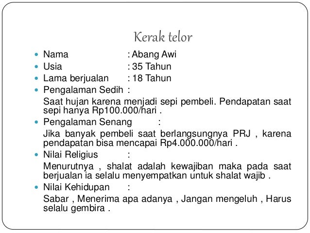 Contoh wawancara dengan pedagang bakso adalah a adalah penulispewawancara dan b adalah narasumber yaitu tukang bakso. Kami memilih topik pedagang bakso karena bakso merupakan makanan khas indonesia yang terbuat dari daging sapi sehingga kami dapat mengetahui bagaimana cara membuat bakso dan lebih mengenalnya. Tentunya wawancara yang dilakukan dengan pedagang cakwe dan bakso dilaksanakan dengan pihak wawancara adalah siswa di sebuah sma negeri favorit. Pengertian macam tugas syarat dan contoh dalam membutuhkan sebuah informasi saat ini kita pastinya memerlukan narasumber untuk dapat diwawancarai. Selamat siang pak boleh saya minta waktu bapak sebentar. Contoh wawancara dengan pedagang narasumber dari sebuah wawancara haruslah orang yang berkompeten dengan harapan informasi yang diberikan juga valid serta bisa dipercaya dan dipertanggungjawabkan.