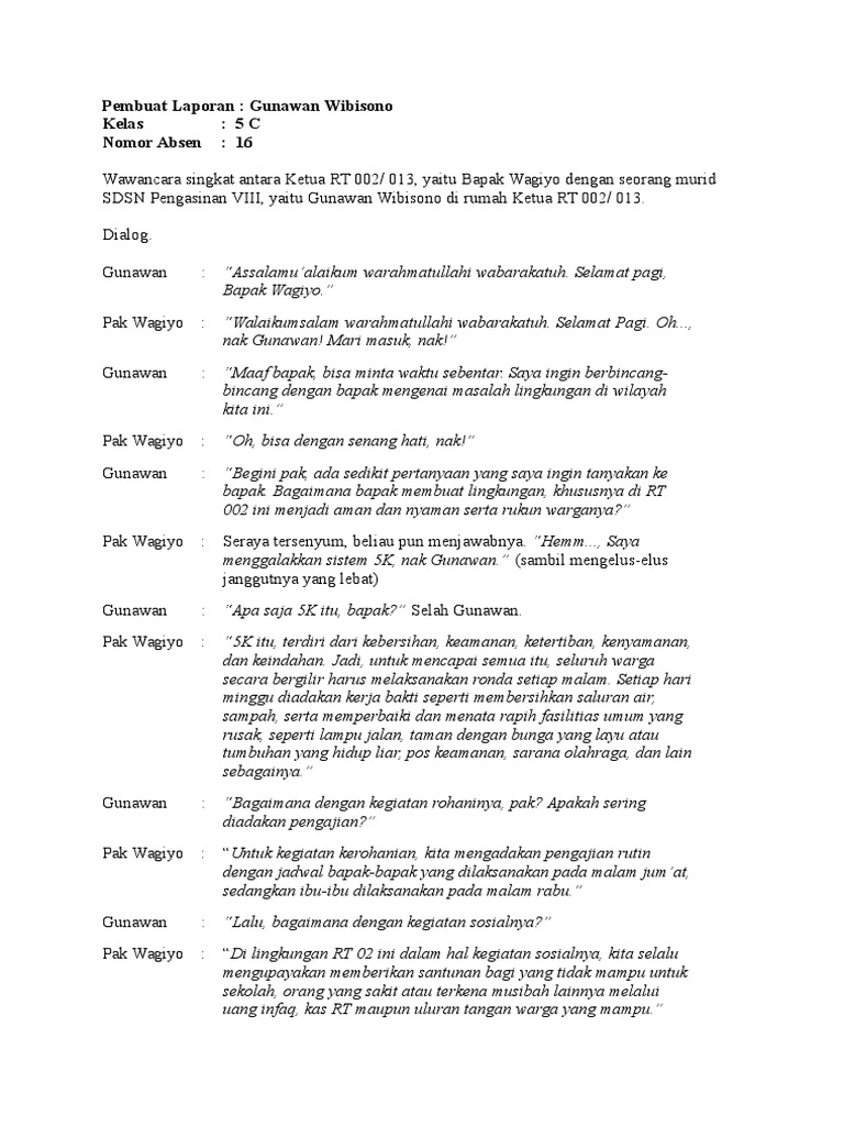 Contoh laporan hasil wawancara laporan hasil wawancara adalah sebuah teks tertulis yang melaporkan suatu wawancara yang telah dilakukan baik itu wawancara dengan pedagang pengusaha guru ketua rt. Dalam contoh teks wawancara setiap teks akan sangat beragam sesui dengan tema yang diangkat namun secara konten atau isi tetap mengacu pada 6 prinsip di atas yaitu 5 w 1h.