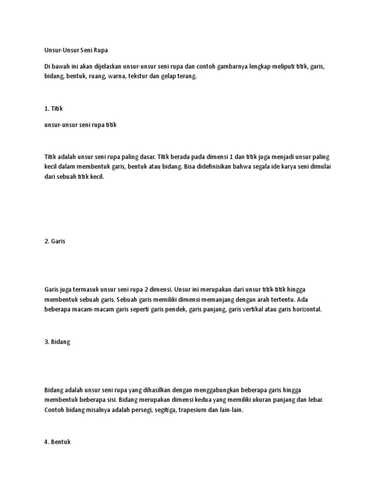 Unsur unsur seni rupa diantaranya yaitu titik garis bidang bentuk ruang warna tekstur gelap terang. Unsur unsur seni rupa seni rupa adalah merupakan salah satu bentuk karya seni yang bisa dinikmati secara audio visual dan audiovisual.